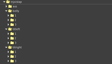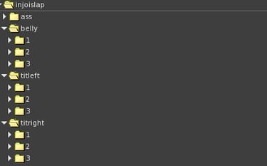To setup RLV Layers, please ensure that you have RLV turned on in your viewer and setup the folders in #RLV as seen below. If you don't have a #RLV folder, simply create one under the Inventory folder. (It needs to be named #RLV). After that is done you need to create a folder in side #RLV called "injoislap" and then inside that folder create another folder called "belly","titleft" and "titright" and then 3 more under that called called "1", "2" and "3". These will be the levels of bruising. (The reason we put a subfolder named "ass" was because in the future the pec slapper will use the same parent folder "injoislap") When you are done making the folders you can drop the BOM you want to attach, or a link to the BOM layer into the corresponding folders. The slapper will add 1 when you have been slapped 3 times, 2 when you have been slapped 6 times and 3 when you have been slapped 9 times. There is a 5 minute timer to remove all layers but will refresh when you have been slapped again. We have included 3 slap layers in the slapper package :)