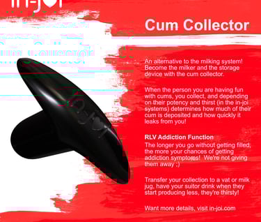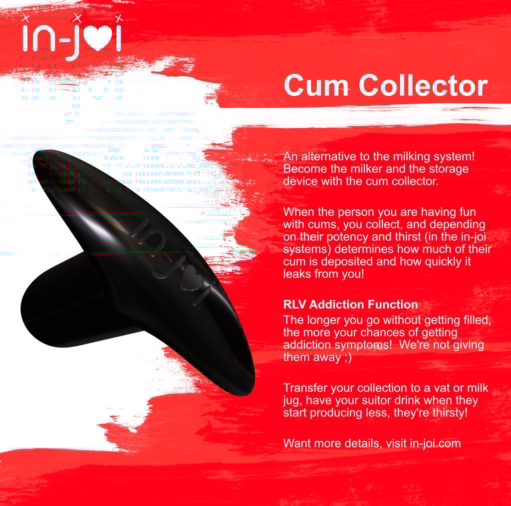 The cum collector detects someone when they are in sensor range (2M) and cum (Works with all major cock brands)! When they cum, depending on their thirst and quality depends on how fast their load will leak out of you and how much gets deposited. Thirst is augmented by drinking milk, and potency is determine by use of any of the systems! The Collector is connected to the same stuff the milking/juicing and pregnancy systems are connected to giving a holistic connection to the in-joi collection.